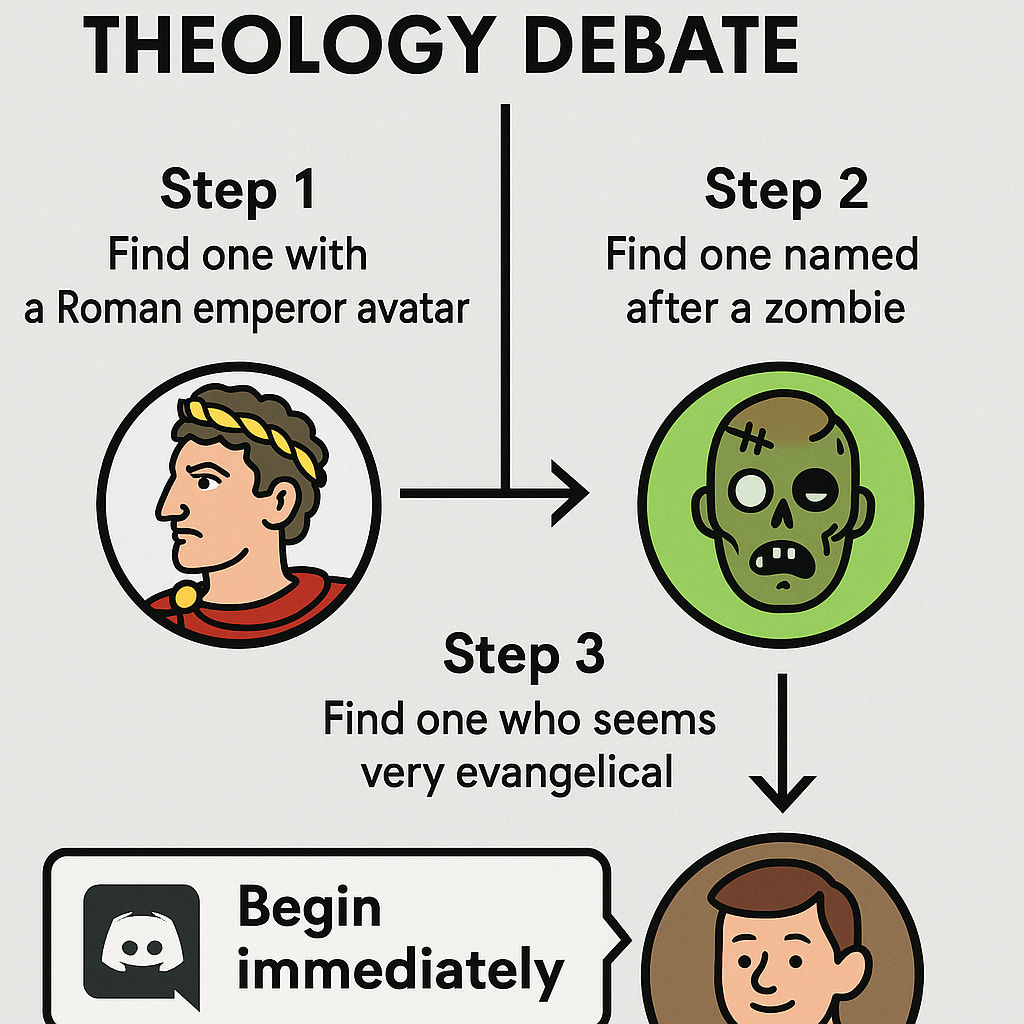 Find three strangers in a Discord server. One has a Roman emperor avatar, one is named after a zombie, one is an evangelical with toaster oven confidence. Begin immediately.