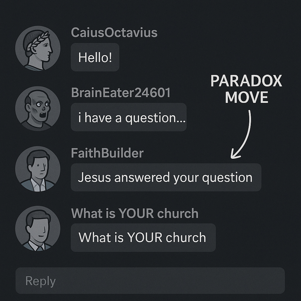 Interrupt at random and insist the entire argument depends on a single Greek verb. Provide a transliteration no one asked for. Repeat it until the chat is functionally unreadable.